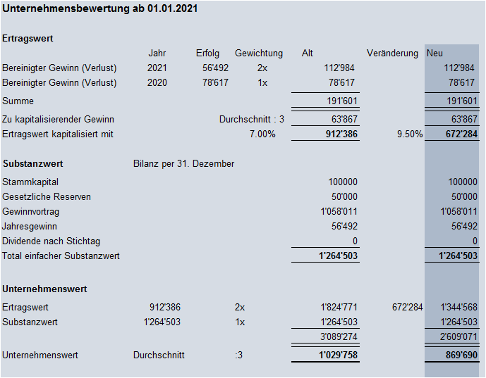 In nachfolgendem Beispiel ist der Einfluss auf den Unternehmenswert und damit den Steuerwert dargestellt, welcher hier um 15.5% abnimmt: